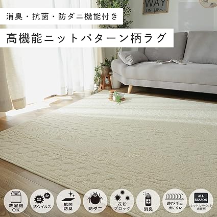 ・【可愛いニット柄・洗濯機で洗える・滑り止めシート9枚入り】敷くだけで不思議とお部屋が柔らかくナチュラルな空間に。心地よさを生み出す、大人気のアラン編みニットパターンの北欧ラグです。汚れても洗濯機で洗えるので、汚れを気にする審判無、定期的に洗濯することで、キレイを保ち、快適に過ごせます。軽量設計なので、女性でも折り畳みや持ち運びができます。コンパクトにたたんで収納できるので、洗濯後や模様替え時の持ち運びもラクラクです。お子様が走り回ったり、掃除をかけたり、ふとしたときにラグがずれてイライラすることなく、快適にお過ごしいただけるよう、こちらの商品には滑り止めシートが付属しております。こちらのラグだけでなく、他のラグマット・カーペットにもご使用いただけます。