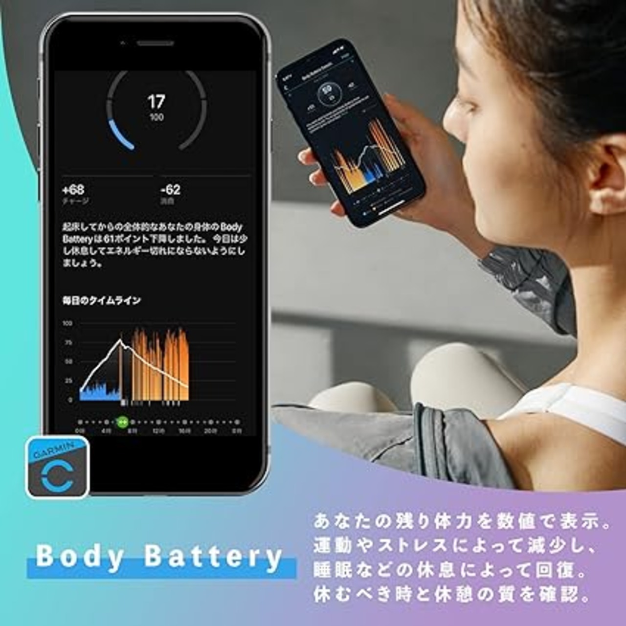 ・主な機能:各種スマートフォンの通知連動 / 歩数計測 / 心拍計測 / bodybattery(体力数値)分析 / ストレス値分析 / 睡眠スコア分析