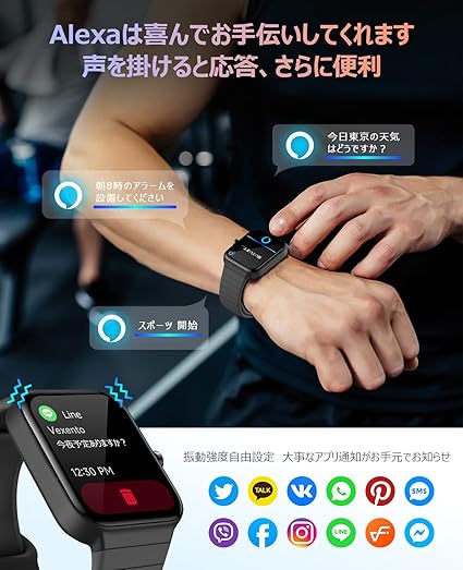 ・【Alexa音声アシスタント&睡眠管理】Alexa音声アシスタントも導入され、スマートウォッチに話しかけるだけで、就寝リマインダーやアラームの設定ができます。スマートウォッチの睡眠モニター機能が自動的に睡眠時間や深い睡眠、浅い睡眠、目覚まし時間などデータ化で記録してくれます。自分の睡眠の状態を把握でき、いい睡眠習慣の改善に役立てられます。