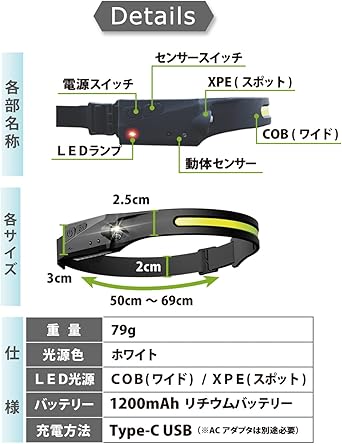 ・タッチレスセンサー機能:ヘッドライトの側面にセンサースイッチが有りセンサーをONにするとセンサーが反応しセンサースイッチの前で手を振るだけで、簡単にスイッチのオンオフが切り替わります。 屋外での作業や、夜釣りの餌付けで手が汚れたり、濡れたりなど必要な時に応じてセンサー機能を使う事が出来ます。