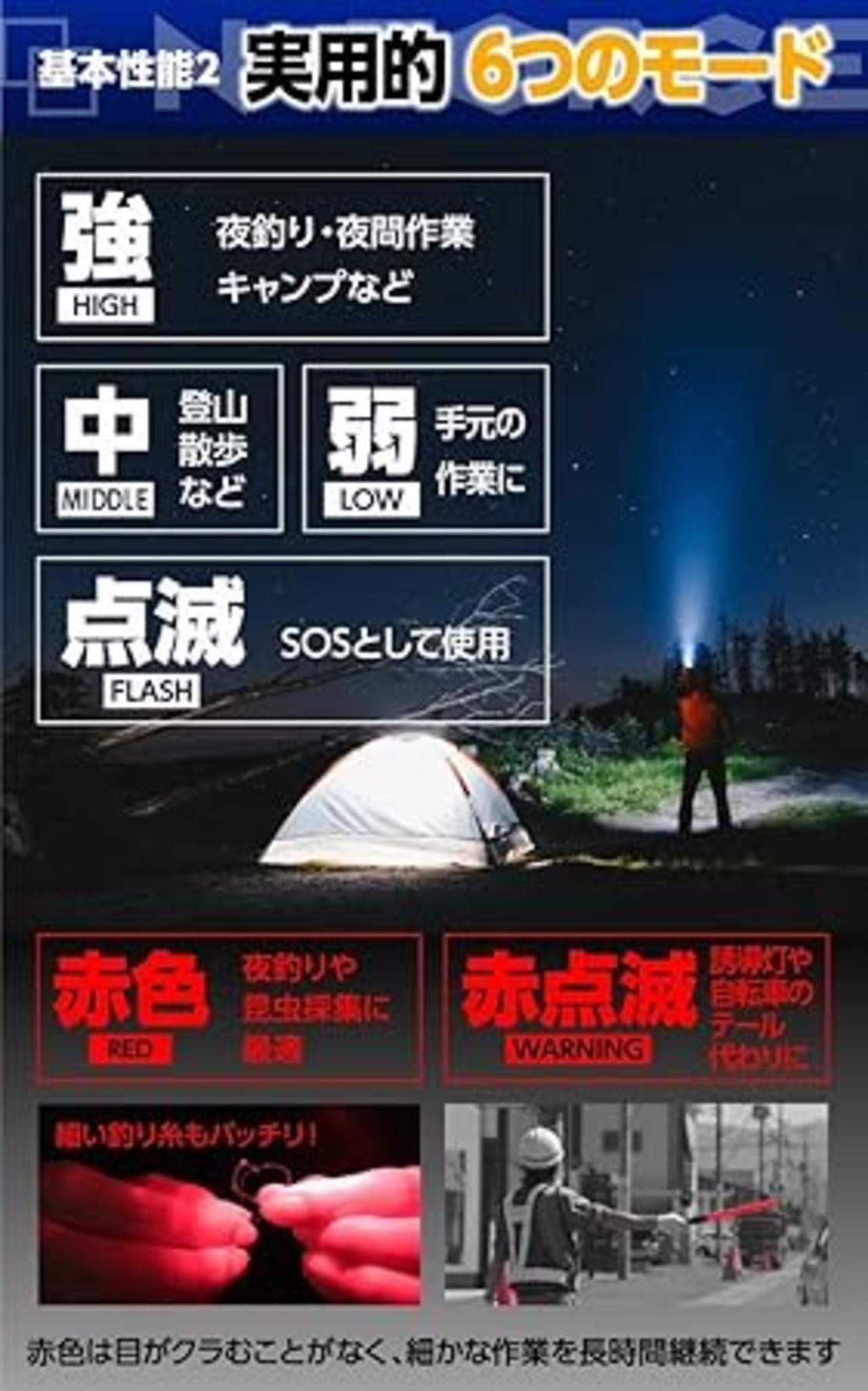 ・ 楽チン操作【 クイックオフ 】搭載。 何度もボタンを連打しなくても1発で消灯できるヘッドライトです。2秒以内にボタンを押せば好きなモードに設定が可能。(※点灯パターンは、白LED-ハイ / ミドル / ロー / 点滅 / 赤LED-店頭 / 点滅 /。) 3秒後以降にボタンを押せば、どのモードからも一発消灯します。瞬時に消灯でき、急にすれ違う歩行者にも迷惑になりません。夜釣りの際にも便利。 .