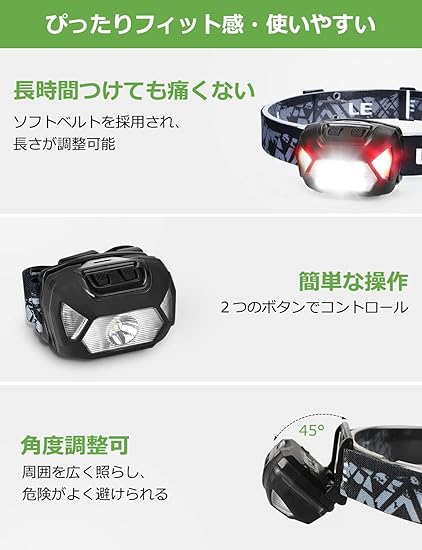 ・【高輝度LEDライト・照射角度調整可・防災停電対策】明るさは300ルーメン、照射距離最大約150メートル。この明るさなら夜の散歩や暗い場所での活動に大活躍!地震、災害や突然停電した時にも役立ちます。ヘッドライトの先端は照射角度(45度まで)調整ができますので、足元だけではなく、照射周囲を広く照らし、危険がよく避けられます。