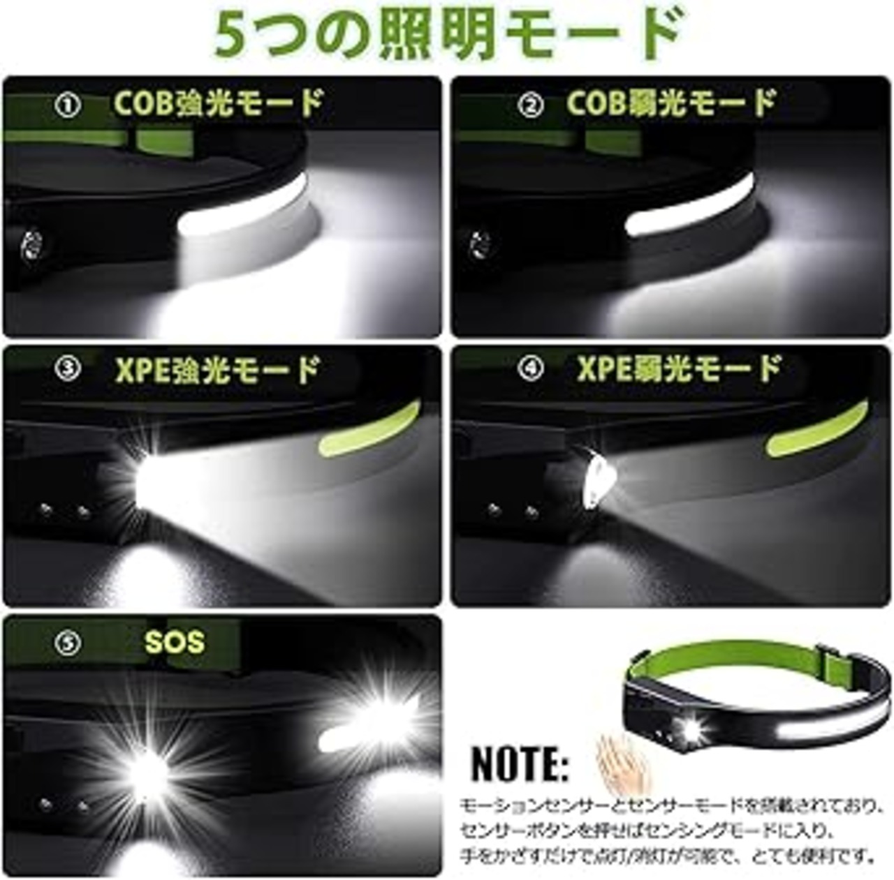 ・【5つの照明モード&230°エリア照明】電源ボタンを押す毎にヘッドライトは下記の実用な5つの照明モードが循環に変わります。COB強光モード(約350メートルの輝度/満充電で点灯時間は約2.5H);COB弱光モード(約150メートルの輝度/満充電で点灯時間は約5H);XPE強光モード(約150メートルの輝度/満充電で点灯時間は約4H);XPE弱光モード(約60メートルの輝度/満充電で点灯時間は約8H);SOS点滅モード(点灯状態でスイッチボタンを長押し)。必要に応じてご希望のモードを利用しましょう。従来の単一光源のヘッド・ライトと比較して、このledヘッドライトは新しいライト構造デザインを採用しています。釣りヘッドライトは230°の広い範囲のヘッドライトとサイドxpeで支配される長距離照明の強い光を使用する。広域照明は、頭の回転を減らすことができますが、照明効果があります。