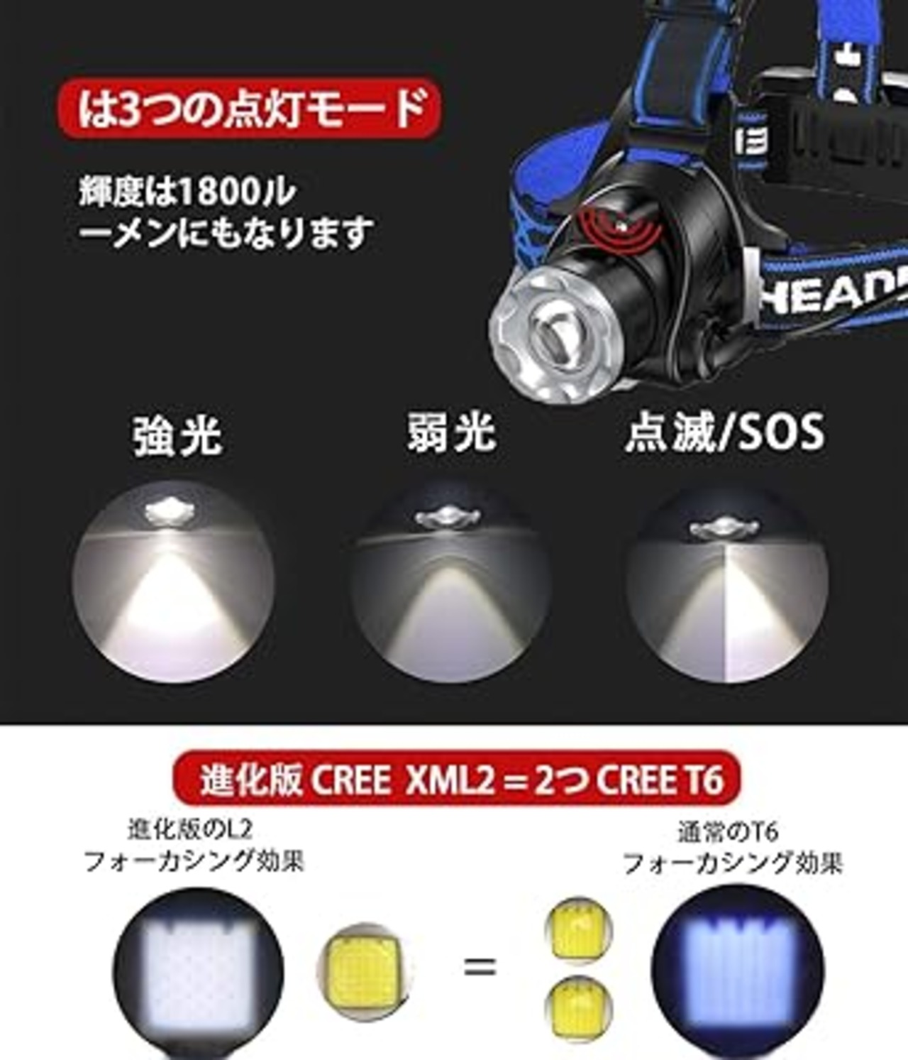 ・【XML2超高輝度】L2グレアランプビーズのCREEアップグレードバージョンを使用し、照明効果は通常のT6の2倍であり、輝度は1800ルーメンにもなります。1.5メートルの耐衝撃性と耐久性を備えています。 伸縮性の高い生地のヘッドバンド、優れた通気性、調整可能な伸縮性、長時間頭に装着しても疲れません。
