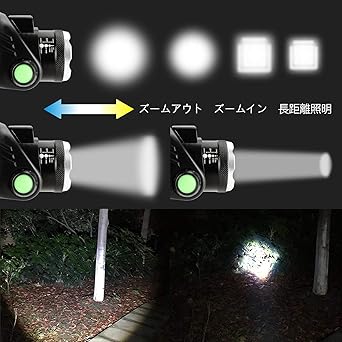 ・【90°調整可能・ズーム機能】ヘッドライトは、約90°調整可能、自分の必要によって、適切な照射角度を調整でき、ズーム機能でフォーカスも調整できます。近距離から遠距離まで均一な光を照射できます。