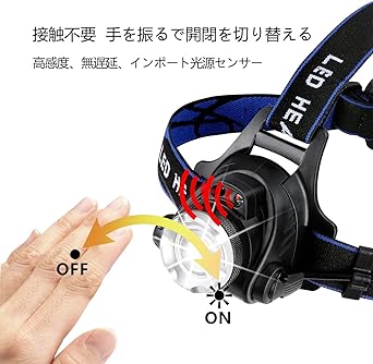 ・【超高輝度・ボディーセンサー搭載】光学凸レンズ、CREE XM-L T6ライト採用され、均一な発光、最強1200ルーメン達明るさ抜群です。照射距離は最大約500Mに達します。また、ヘッドライトはセンシング機能が搭載しますので、手の動きを感知して点灯/消灯が可能です。