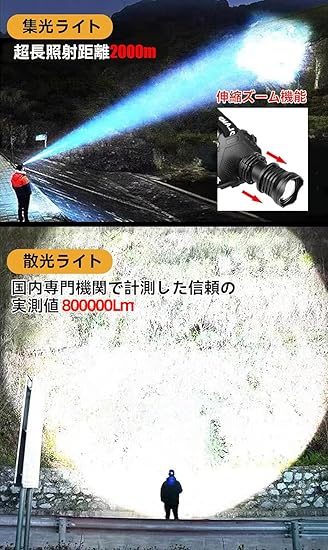 ・【P190を搭載した業界初のヘッドランプ&驚くほど明るい】この爆光ledヘッドライトは、世界屈指のLEDメーカー米国社製のP190を採用し、投射された光束の明るさは完全に同じタイプのヘッドライト灯を超えて、実際の照明輝度は60000ルーメンに達し、最大照射距離2000mをサポートします。この高輝度ヘッドライトは、通常のP50ヘッドライトの約10倍の明るさです。T6照明の約20倍です。L2の18倍です。米軍をはじめ、世界の軍隊、警察・消防機関が多数採用する米CREE社が誇る超高輝度スーパーLED!国内家電量販店では絶対に手に入りません!LEDチップは約10万時間の超寿命!!比較的長持ちし、ランニングコストが安いという特徴があります。一度購入してしまえば、充電する際の電気代のみで長期間に渡って使用可能です。