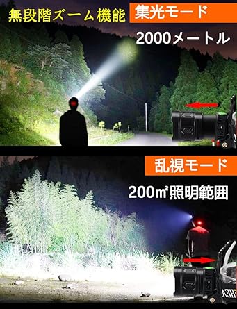 ・【IPX-65防水+無段階ズーム機能+多様な使用方法】 IPX-65防水グレードは、大雨にも安心して対応できます。ランプヘッドを伸縮して、焦点距離を変更します。光斑サイズ、光照射の距離(照明距離:500 - 2000メートル)と明るさを勝手に調節して。 夜の出かけ、頭に装着するのが不便な場合は、ヘッドバンドを取り外してベルトに取り付けることができます。 危険な作業には、ヘッドライトをヘルメットに取り付けることができます。 キャンプ、夜釣り、自転車ライト、登山、ランタン、停電、防災、地震対策、車のメンテナンス、読書、操作灯、その他の家庭用照明で広く使用されています。