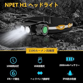 NPET LED ヘッドライト USB充電式 高輝度 超軽量 強力 小型 CREE社製LED 1100ルーメン明るい 6モード SOS点滅