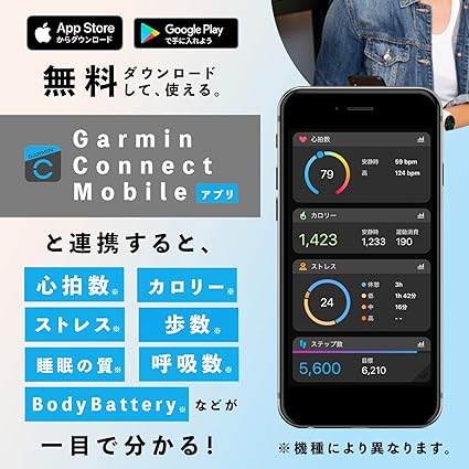 ・健康管理機能:Body Battery、ストレスレベル、睡眠スコア、血中酸素トラッキング、フィットネス年齢、生理・妊娠トラッキング、水分補給 / スポーツ管理機能:高精度GPS、様々なスポーツ機能 / スマート機能:各種通知、Suica決済、援助要請・事故検知、Android 及び iOS のどちらも利用可能