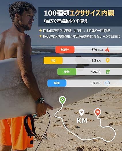 ・【100種類運動モード・IP68級完全防水】スポーツウォッチはウォーキング、ランニング、サイクル、登山、サッカー、ヨガなど様々なスポーツモードがあって日常のトレーニングに完全に満足!歩数、消費カロリーなどの活動量データを可視化することによって、運動への意欲を高め、運動不足解消をスマートにサポート!IP68防水規格を搭載しており、雨や洗顔の水滴には耐えてシャワーやプールなども取り外す必要がありません。※水温が40℃未満にしてサウナや海水などのご利用はお控えください。