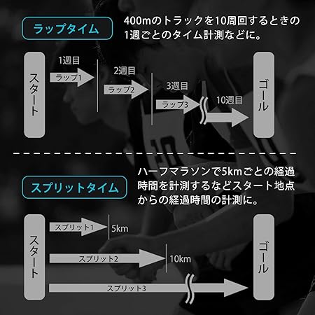 ・・約1.2倍の大画面液晶(※同メーカー商品比較)で記録がはっきりと見えます。スプリットタイム/ラップタイム/計測タイムを一画面で同時に確認することができます。