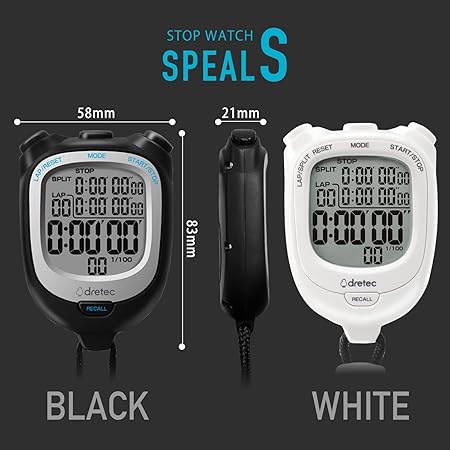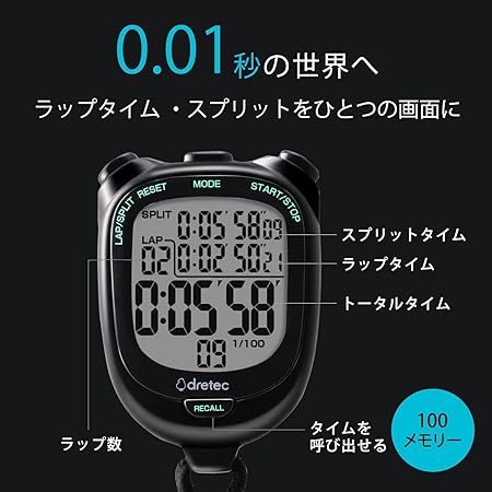 dretec(ドリテック) 大画面で見やすいストップウォッチ 0.01秒単位で計測 ラップ/スプリット機能 電池交換可 消音 勉強 ブラック