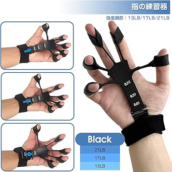 ・セット内容:2個指ストレッチャー(ブラック+グレー)、1個リストバンド 強度調節:13LB/17LB/21LB(ブラック) 、6.6LB/8.8LB/11LB(グレー) 商品サイズ:縦12cm×横11cm/穴径1.8cm/横高2.8cm