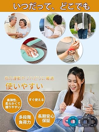 ・【理学療法士のお勧め握力きんとれグッズ】初めは軽い負荷から始めて、 徐々にトレーニングの強度や種目を増やしていくことは筋トレの原則に則って、3in1パワーグリップはかわいいドーナツ型で人間工学に基づいて設計されており、3つの負荷力は選択可能で、均一な力をかけ、中学生でも握りやすいサイズ感で、手の筋肉をリラックスさせ、ストレス解消します。2in1指穴型フィンガーパワーは2つの負荷力は選択可能で、リストストラップなしで始められるので使いやすく、必要に応じて2本/3本/4本/5本の指で筋トレをすることはできます。