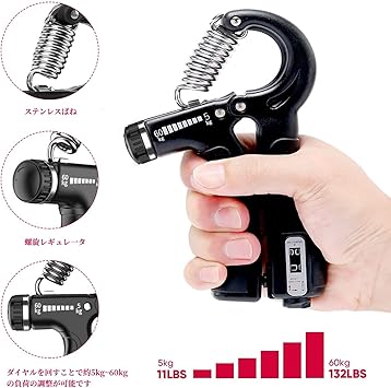 ・【ハンドグリップ】握力を鍛えるためのトレーニング器具 ハンドグリップ。負荷調整は約5KGから60KGまで無階段調整できます。 回数測定カウンターが付いているので、何回グリップしたか計測可能です。計測回数は00〜99となっております。ハンドル底のリセットダイヤルで簡単にカウンター数値を00にリセットすることができます。