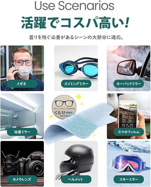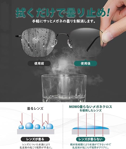 ・【簡単にくもり止め】メガネ拭きは水分と油分の吸収性の高いスエード調の機能素材(超微細繊維)を採用するので、雨の日や湿度が高い日でも、このメガネくもり止めを使えば、メガネを一拭きするだけで、明瞭な視界を取り戻すことができます。