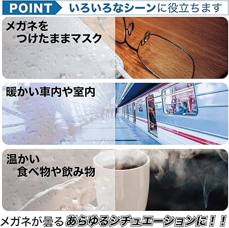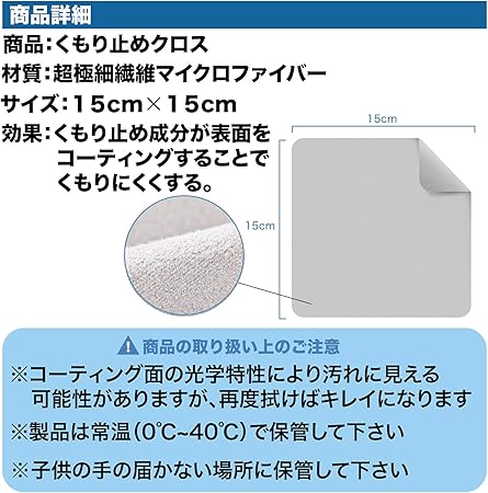 ・【曇り止め】レンズ表面に親水性被膜を作ることによりレンズが曇らなくなります。マスクをつけた時、食事の時、通勤時など、いろいろな助けになるメガネくもり止めクロスです。