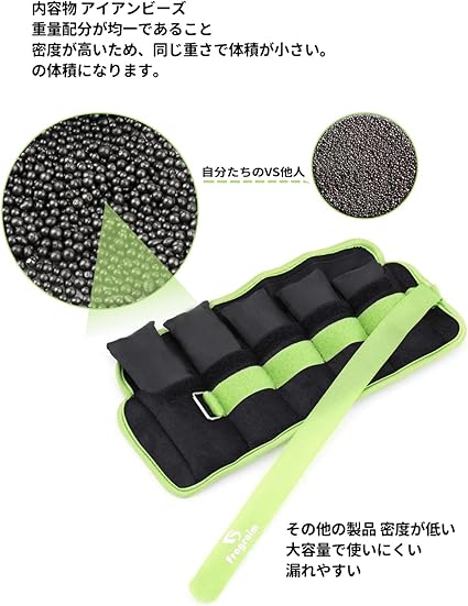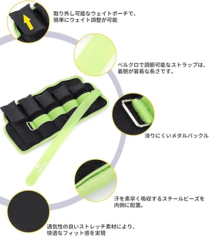 ・【5段階調整モード】砂袋 (1個)0.15kg 片足0.75kg(5袋入り) 重さは両足あわせて1.5kg、5段階重量調節できますので、体格や運動強度、運動時間によって調整してください。手首・足首両方使えます。