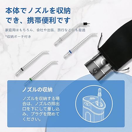 ・【2種類共4本ノズル&360°回転】2種類計4本替えノズルが付いています。水流ノズルは3本付き、3 つの異なる色をご用意していますのでご家族と使えいただけます。もちろんポイント磨きノズルも1本付き、歯並びの悪い箇所や歯列矯正など磨きにくいところをきれいに磨けます。360°回転可能なノズル設計により、歯ブラシの届きにくい所まで洗浄できます。また、ノズルの設計を最適化し、最大2.5kgの引抜力に対応し、ノズルロック解除ボタンを押さずに直接ノズルを引き抜いてもノズルが破損しにくくなっています。本体上部にはノズル収納スロットも設計されており、1本のノズルを収納でき、外出時に収納袋に収納する必要がありません。人間工学に基づいた設計ですので、小さな手でも簡単に握りできます。