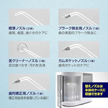 ・ジェット水流で歯垢や食べカスを強力洗浄! 毎分最大1800回の脈動で気になる汚れを洗い流します。 360度回転するノズルは、気になる箇所もピンポイントで洗浄可能。 替えノズル+用途に応じて使える4種類のノズルが本体に収納されています。 プラーク除去、歯周ポケットのケア、舌の汚れなど、これ1台で様々な悩みに対応。 細かい水流で刺激することにより、歯ぐきも優しくケアします。