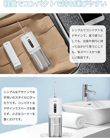 ・【シンプルで、持ち運ぶ本体デザイン】ウォーターピックの本体には280ml水タンク、モーター、ノズルから構成されています。シンプルでコンパクトなデザインで、家で使うにしても、出張や旅行に持って出かけて使うにしても、省スペースかつ美しい製品です。本ジェットウォッシャーは簡単な収納設計があって、タンクとモーターを分けた後にノズルを水タンク内に収納することができて、外出する時空間を節約します。