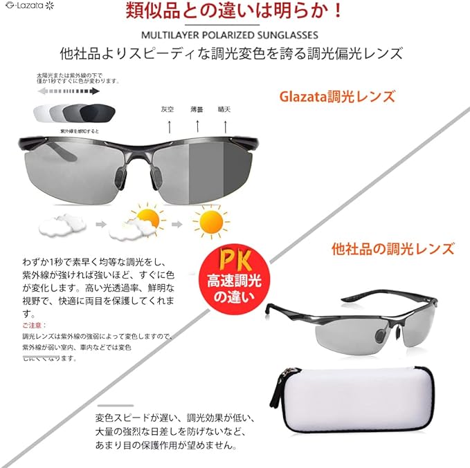 ・?【よりクリアな視界】調光レンズが紫外線の強弱に従って変化 レンズの色濃度を自動調整, 最適な視界を提供してくれます。複雑な天気もに気軽に対応,晴れの日はもちろん、雨天、雪、曇りの日にもかかわらず強烈に降り注ぐ日差し、路面、水面、雪面からの照り返し、運転や釣り等でガラスやギラギラを効果的にカットし、クリアで快適な視界を提供します。