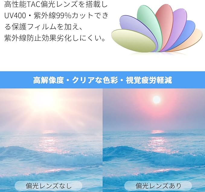 ・【偏光サングラス】 シンプルなのに高性能 サングラス !紫外線( UV )カット99.9パーセント以上カットはもちろんのこと、偏光レンズなので眩しさや反射光もブロックし、太陽光から目を保護します。