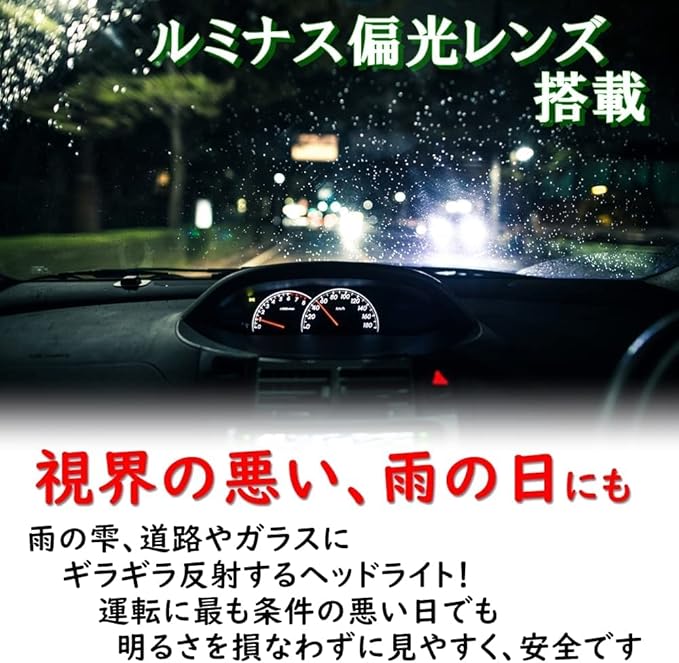 ・車のヘッドライトの青白い光には多くのブルーライトが含まれています。そのブルーライトを大幅にカットするルミナスイエロー弱偏光レンズを搭載。雨の日の濡れた路面からの乱反射軽減にも絶大な効果あり。