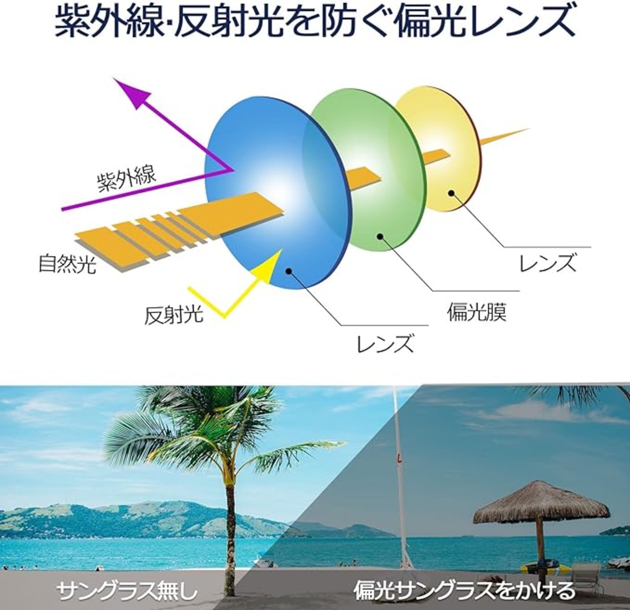 ・【TAC偏光レンズ】表面に特殊な9層も重ねてコーティング技術加工しています、有害な光や、乱反射な光を100%カットして,強い日差しから目を守ってくれます。視界を鮮明に保ちますTAC偏光トリアセテートレンズは、耐衝撃性、軽量性、耐久性が優れて、長く使えまられ。