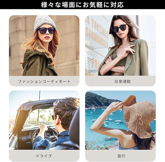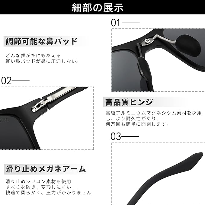 ・高品質の偏光レンズ:100%UV400コーティング。有害な紫外線(UVA&UVB)を 100%カットし、目を保護します。路面、雪や海などの反射光を抑え、眩しさを軽減しつつ、もとの色を忠実に再現。乱反射光をカットし、快適な視界を提供します。