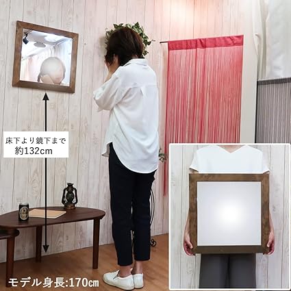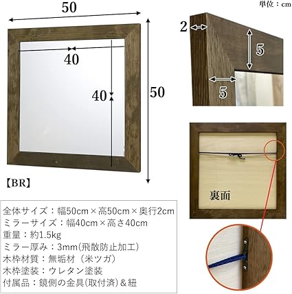・【 サイズ 】 全体:幅 50 cm 奥行 2 cm 高さ 50 cm ミラー 面:幅 40 cm 高 さ 40 cm フレーム 幅:5 cm 【 重量 】:(約) 1.5kg 【 主材 】:天然木 (米ツガ材 ) 【 背板 】:ベニヤ板 【 副材 】:金具&紐 【 ミラー 】:3mm ( 飛散 防止 加工 ) 【 塗装 】:ウレタン 樹脂塗装 【 原産国 】:日本製 【 梱包 サイズ 】(約) 幅 60 cm 奥行 5 cm 高さ 55 cm 【 梱包 重量 】(約) 2.5kg