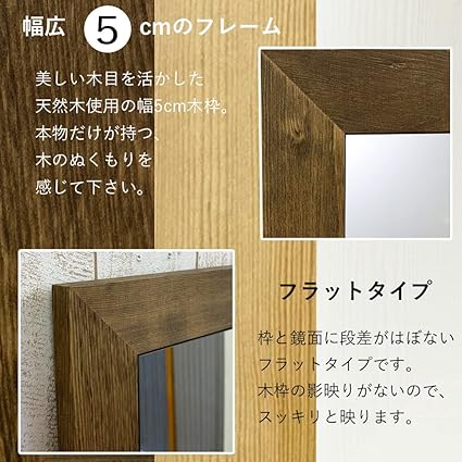 ・【 天然木 フレーム 5cm 】木目 が 美しい 天然 の 無垢材 を 使用した 約5cm の 幅広 木枠 。玄関・リビング・洗面所など、場所を選ばず、どんなお部屋でもおしゃれに演出。【 フラットタイプ 】木枠 と 鏡面 の 段差 が ほぼない フラットタイプ です。木枠の影映りがないので、スッキリと映ります。
