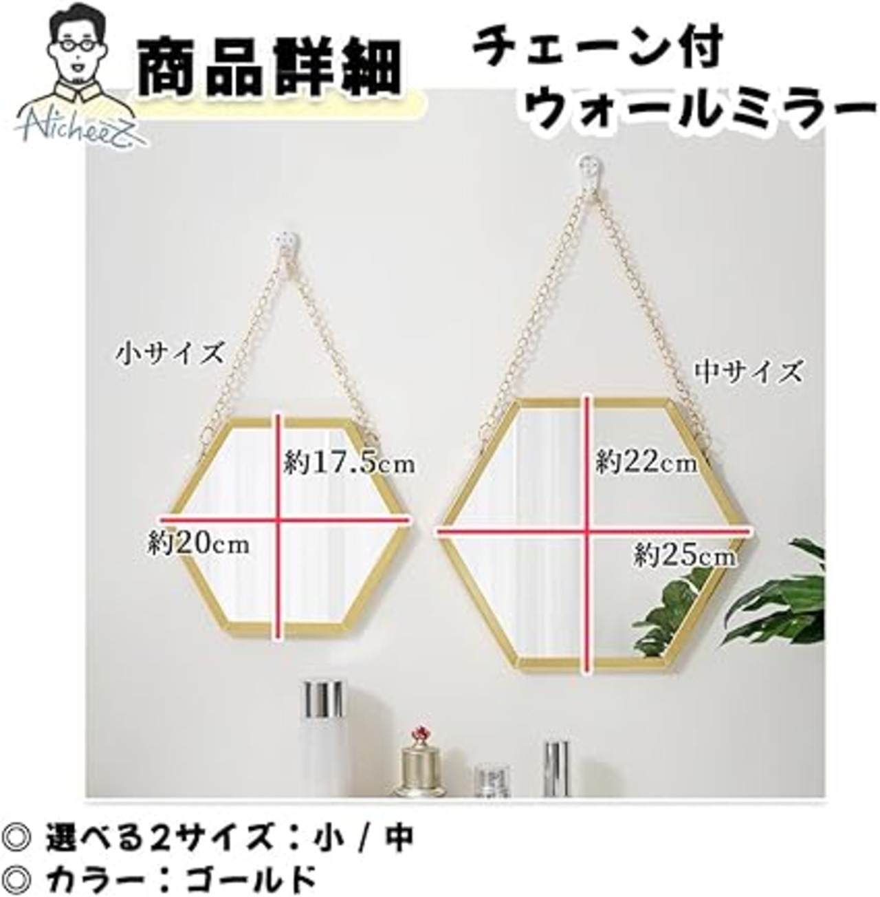 ・【商品内容】 チェーン付ウォールミラー カラー:ゴールド Sサイズ:縦/約17.5cm 横/約20cm Mサイズ:縦/約22cm 横/約25cm