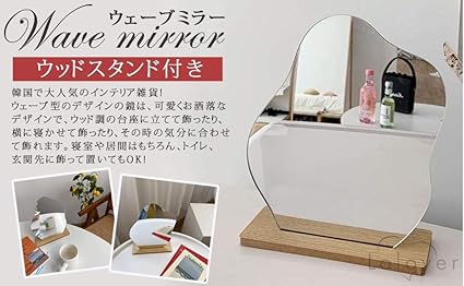 ウェーブ型のデザインの鏡は、可愛くお洒落なデザインで ウッド調の台座に立てて飾ったり、横に寝かせて飾ったり、その時の気分に合わせて飾れます。