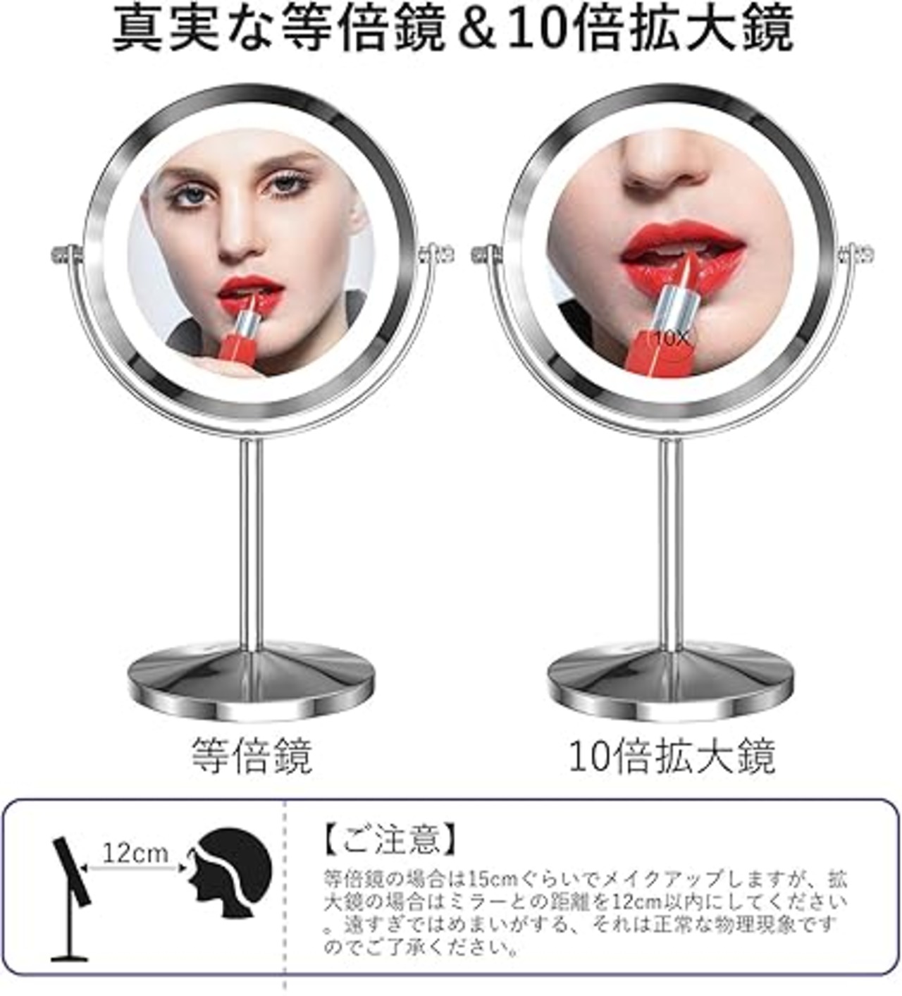 ・【等倍鏡・10倍鏡付の2つが表裏に】 こちらの両面鏡は、片面が真実の鏡でありながら、通常の鏡では見えにくい部分もしっかり見える10倍鏡も搭載されております。必要に応じて使い分けできて超便利です。毛穴までもバッチリ見えますので、顔の手入れ、眉カット、あと男性でも眉毛やヒゲ、鼻の穴のチェックに使えます。老眼が始まった方、普段使いの方、どちらともオススメします。(10倍鏡をお使いの際には、鏡に約10cm程度でお使いいただく必要があります。)