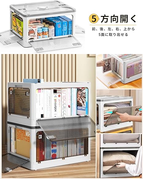 ・【5面開閉可能・超便利】5面開閉式収納ボックスはどこからでも開けれるので詰める順番を考えずに、ポイポイ入れれるのが便利です。ボックスの天面に重い物も入れても、前、後、左、右から取り出せる可能です。一方向からしか取り出せない入れる伝統の収納ケースに比べて、使用頻度の低いものを取り出すのが不便になる心配はもうありません。こんな収納ボックスは本当に宝物です。