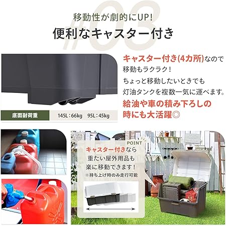容量140Lのコンテナー(ストッカー)。18Lの灯油缶なら4個、20Lの灯油缶なら3個収納可能。重い物でも取り出しやすく、市販の南京錠が付けられる鍵穴付きで、防犯対策もバッチリです。