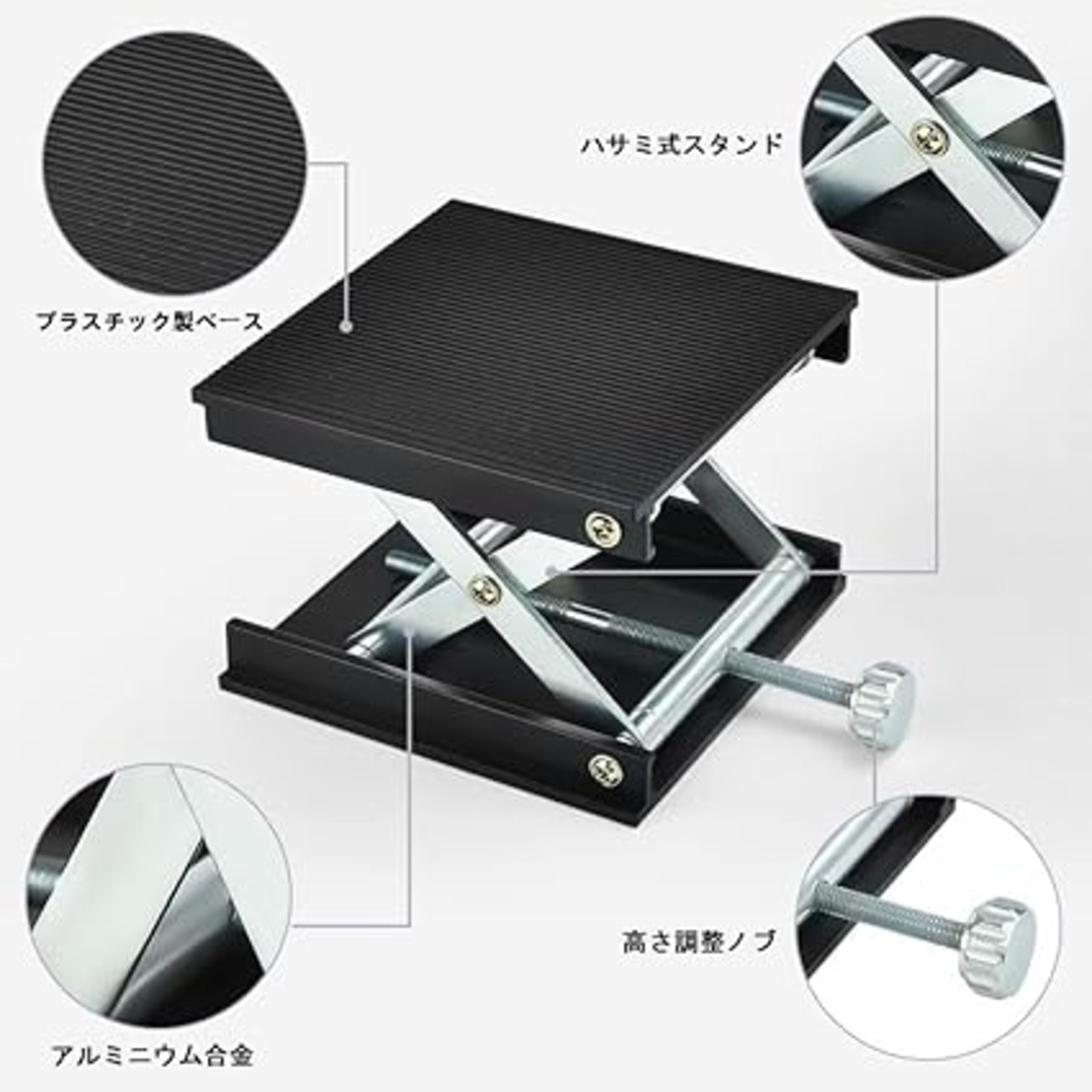 ・?【ミニサイズ昇降台】:小型の卓上昇降作業台、ハンドルを回すだけで昇降台が上下に移動できます。サイズ:90×90mm;昇降範囲:30mm〜90mm;カラー:ブラック;重量:160g。 素材:プラスチック+アルミニウム合金。ミニサイズで、スペースを取らず、バックに入れて持ち運びに便利です。いつでもどこでも使えます。