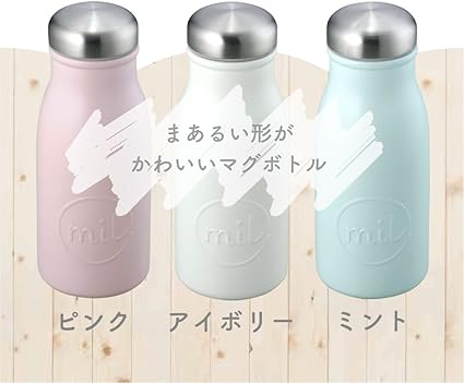 牛乳ビンみたいなまあるい形がかわいいマグボトル。真空断熱構造で保温も保冷もOK。持ち運びやすい容量350ml。