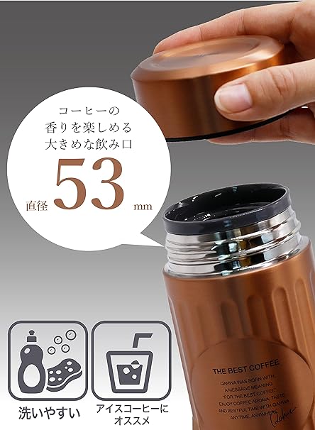 ・【香り立つ飲み口】飲み口は、コーヒーの香りを楽しめるように大きめ設計の約53mm。コーヒーカップで飲むときのような豊かな香りをお楽しみ頂けます。氷も入れやすいので、アイスコーヒーにも便利。