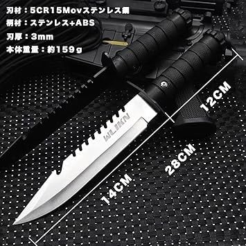 ・【基本情報】刃材:5CR15Movステンレス鋼 柄材:ステンレス+ABS 全長:28cm 刃渡り:14cm 柄丈:12cm 刃厚:3mm 本体重量:約159g ケース重量:約18g