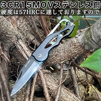 ・【ナイフの仕様】全長:15cm、刃体長さ:6cm、素材:3CR15MOVステンレス鋼、重量:超軽量50g、刃の幅:19mm、硬度:57HRC、安全ロック機構付き