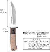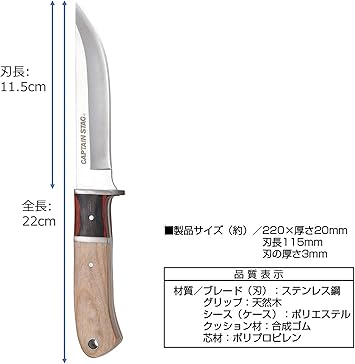 ・材質:ブレード(刃)/ステンレス鋼、グリップ/天然木、シース(ケース)/ポリエステル、クッション材/合成ゴム、芯材/ポリプロピレン