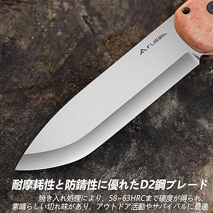 FLISSA アウトドアナイフ シースナイフ D2鋼ブレード フルタング構造 天然ウッドハンドル キャンプ ナイフ 薪割り 登山 徒歩 DI