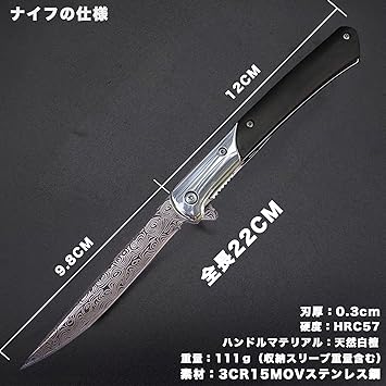 【ナイフの仕様】全長: 22cm(折畳サイズ12cm)、刃体長さ:9.8cm、素材:3CR15MOVステンレス鋼、を採用して、耐久性が良い。重量:111g(収納スリーブ重量含む)、刃厚さ:約3mm、硬度:57HRC、ハンドルマテリアル:天然白檀