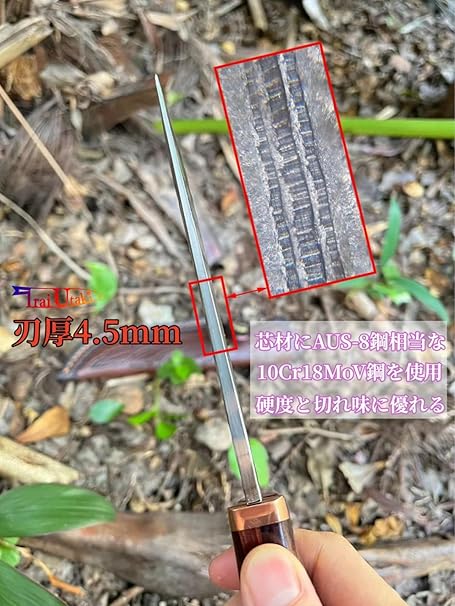 ・【切れ味】硬度:60HRC。4層の合金鋼材にAUS-8相当の芯材10Cr18MoV鋼を使用、槌目模様と波紋が特徴的。耐久性が高いホローグラインドで、切れ味が落ちにくいです。釣り、キャンプ、徒歩などのアウトドアに向いています。