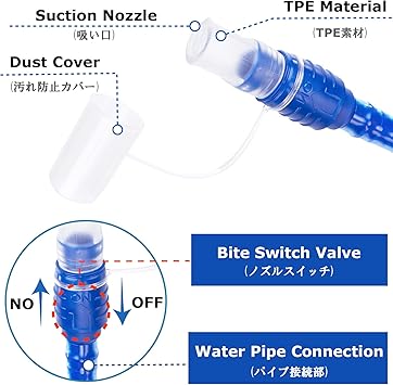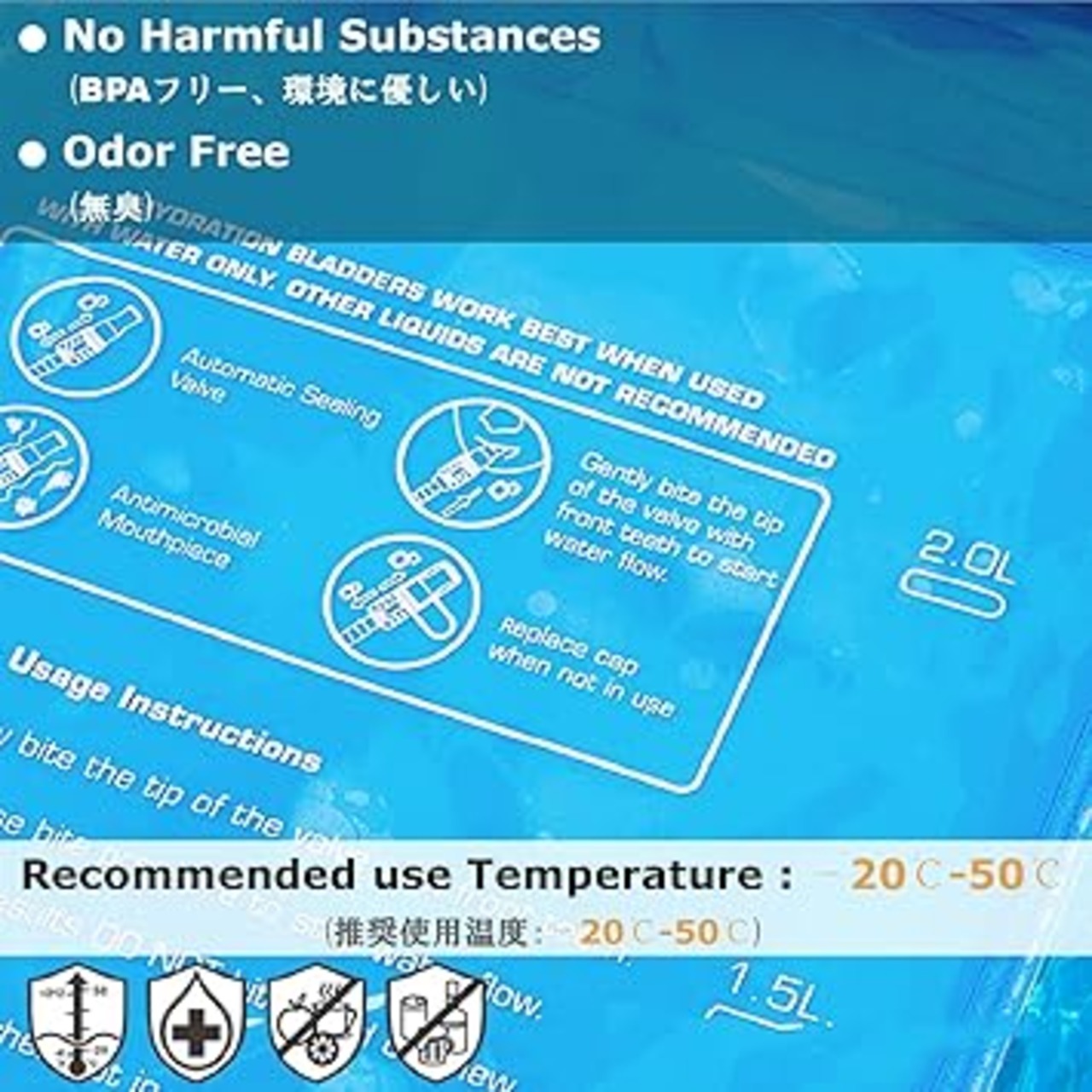 ・【袋本体】ハイドレーション給水袋本体はPEVA素材で作てられ、BPAフリー、雑菌の繁殖を抑え、無臭です。使用温度: 0~40℃