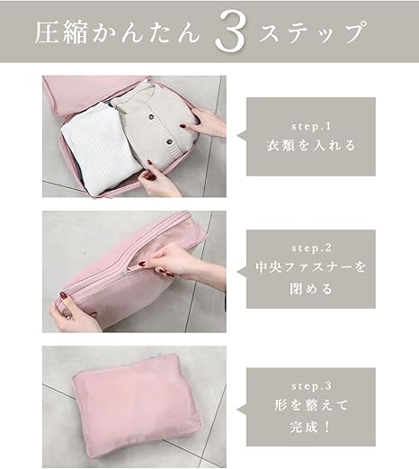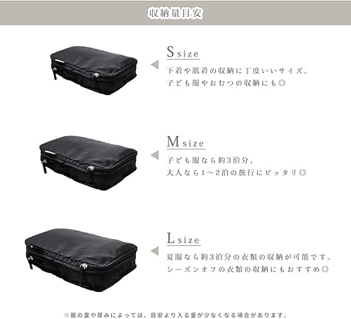 ・荷物を小さくしたい旅行にピッタリ! 圧縮トラベルポーチS・M・Lサイズの3点セットです。 ファスナーを閉めるだけで簡単圧縮できるので、 かさばる旅行の荷物もコンパクトに! 旅行だけでなく、お子様のおむつ収納としても◎ ジムやスパなどの着替えを持ち運ぶにも便利です!