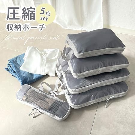 [ジゼル] 圧縮ポーチ 旅行用圧縮袋 トラベルポーチ 5点セット 簡単圧縮 衣類仕分け ポーチ トラベルバッグ メンズ レディース (グレー